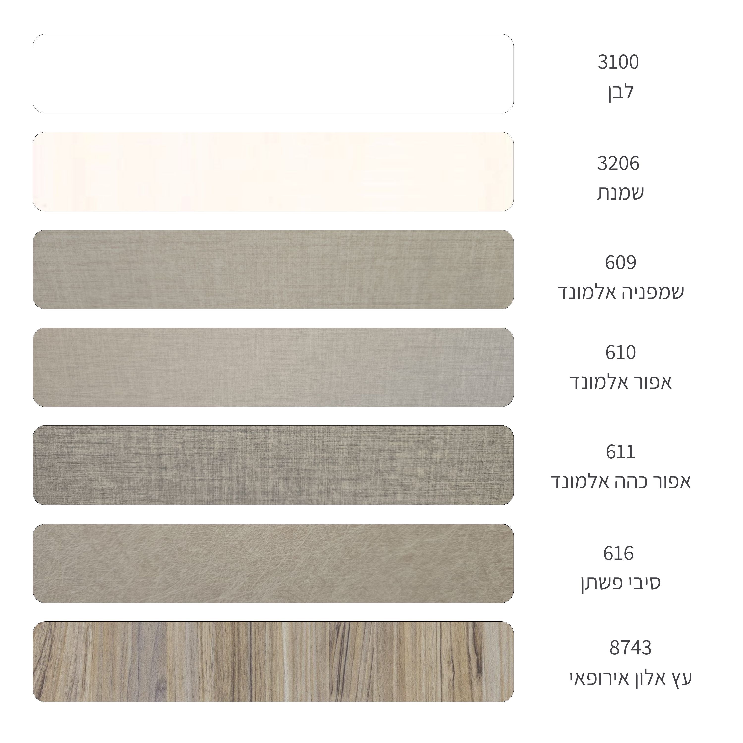 | צבע דופן הארון | אלון אירופאי 8743, אפור אלמונד 610, אפור כהה אלמונד 611, לבן 3100, סיבי פשתן, שמנת 3206, שמפניה אלמונד 609 |